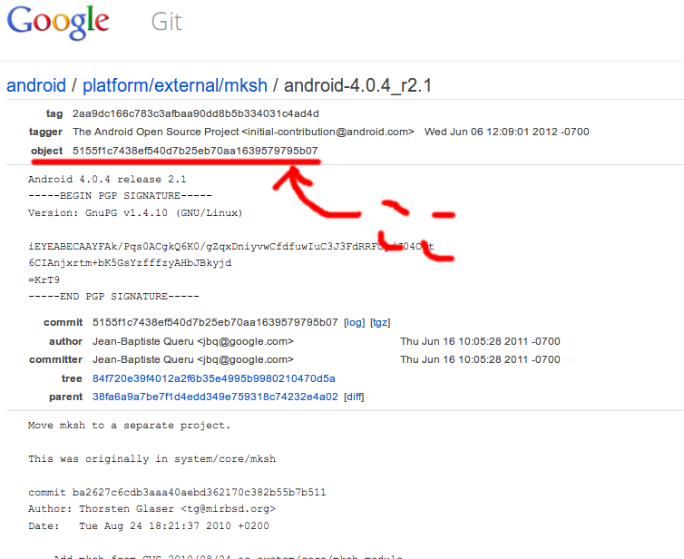 で、AOSPのGitのmkshとかいうパッケージのバージョンがandroid-4.0.4_r2.1のページに飛んでみる。$ echo 319ce8db8442d58f8d98eaf58becca74d817734f > external/svox/.git/HEAD